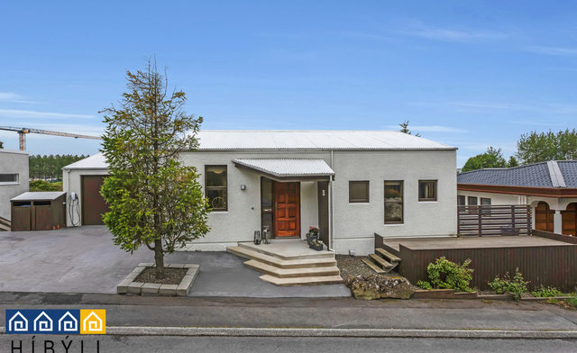 [email protected] Lýsing eignar Falleg aðkoma er að húsinu. Steypt, munstrað plan með bílastæðum framan við húsið. Efri hæð: Anddyri : Flísar á gólfi, fataskápar. Stofur : Stórar og bjartar stofur, flísar á gólfi, verulega aukin lofthæð. Gólfsíðir gluggar sem ná á milli hæðanna setja mikinn og fallegan svip á húsið. Úr borðstofu er útgengt á skjólgóðar og sólríkar suðursvalir sem snúa inn í garðinn. Hjónaherbergi: Rúmgott herbergi, parket á gólfi, góðir skápar, aukin lofthæð. Baðherbergi: Flísar á veggjum og gólfi, flísalögð sturta með glerhlið sem gengið er slétt inní, upphengt salerni, gluggi. Eldhúsið: Flísar á gólfi, opið við stofur, hvít innrétting með góðu skápa og vinnuplássi, gluggi, granít á borðum og stór eyja sem unnt er að sitja við. Þvottahúsið: Mjög rúmgott, flísar á gólfi, vegleg innrétting með miklu skápaplássi (efri og neðri skápar), tengi fyrir þvottavél og þurrkara, skolvaskur, gluggi. Innangengt er úr þvottahúsi inn í bílskúrinn. Bílskúr : Flísar á gólfi, geymsluloft yfir hluta skúrsins, hiti, rafmagn og rennandi vatn. Búið er að stúka af hluta skúrsins og nýta sem skrifstofu/vinnnuaðstöðu, flísar á gólfi og gluggar í tvær áttir. Neðri hæð: Sjónvarpshol: Flísar á gólfi, væri hægt að stúka af og nýta sem svefnherbergi. Tvö góð svefnherbergi: parket á gólfum í báðum herbergjum, fataskápur í öðru. Á gangi framan við herbergin eru einnig fataskápar. Baðherbergi : Endurnýjað fyrir fáeinum árum, flísar á veggjum og gólfi, baðkar með flísalagðri hlið, sturtutæki einnig við baðkarið, hvít innrétting undir vaski, upphengt salerni. Við stigann á milli hæðanna er útgengt í garðinn sunnan við húsið. Garðurinn er mikill sælureitur, gróinn og vel hirtur með pöllum að hluta og heitum potti. Garðurinn er mjög fallegur með pöllum og heitum potti (hitaveituskel). Góður geymsluskúr er einnig á lóðinni. Lóðin er með timpurpöllum að hluta og tyrfð að hluta. Snjalllýsing er til staðar í eigninni. Búið er að leggja þriggja fasa rafmagn og setja upp rafhleðslustöð í bílskúrnum. Húsið að utanverðu (múr og tréverk) var málað árið 2021 Þakjárn hússins var yfirfarið og málað árið 2021 Glæsileg eign á eftirsóttum og veðursælum stað. Stutt í skóla, leikskóla og alla helstu verslun og þjónustu. Einnig stutt í allar helstu stofnæðar höfuðborgarsvæðisins. Nánari upplýsingar á skrifstofu Híbýla í síma 585-8800 eða á netfanginu